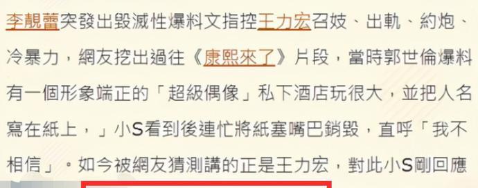 最后一位被牽連的女星并沒有和王力宏傳出緋聞,但疑似知道王力宏的劣跡,她就是小S。之前在某檔節目中,有人當場爆料天王級別的偶像人物私生活混亂,還寫在紙條上給小S看,小S看到后感到十分震驚,有網友猜測,這位“超級偶像”,很可能就是王力宏。