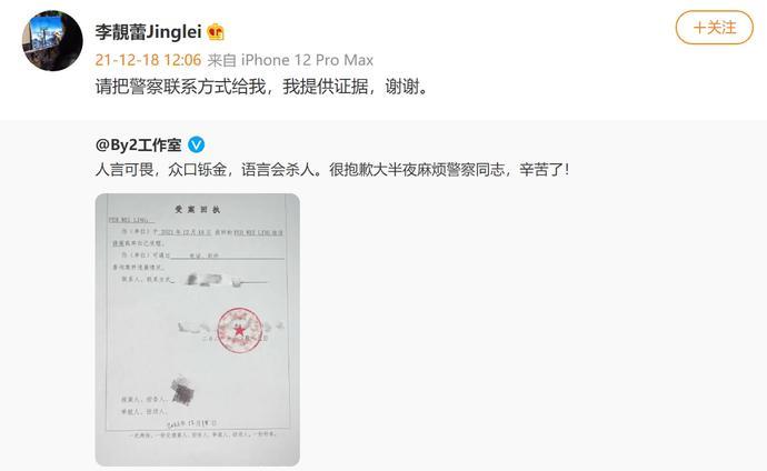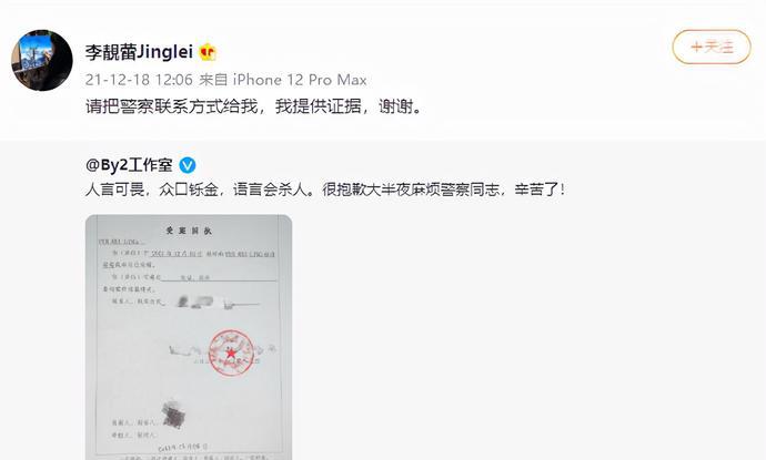 面對如此丑聞,By2的態度十分強硬,直接在深夜報警,還曬出了回執單。讓人沒想到的是,李靚蕾正面剛,直接轉發該動態,并稱:“請把警察聯系方式給我,我提供證據,謝謝”!完全就是絕地反擊,被爆料者本人點名實錘。