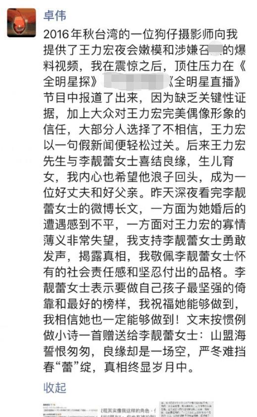 而最開始爆料王力宏夜會嫩模的卓偉,發長文“補刀”,稱王力宏寡情寡義,并佩服李靚蕾敢于揭露這一切。