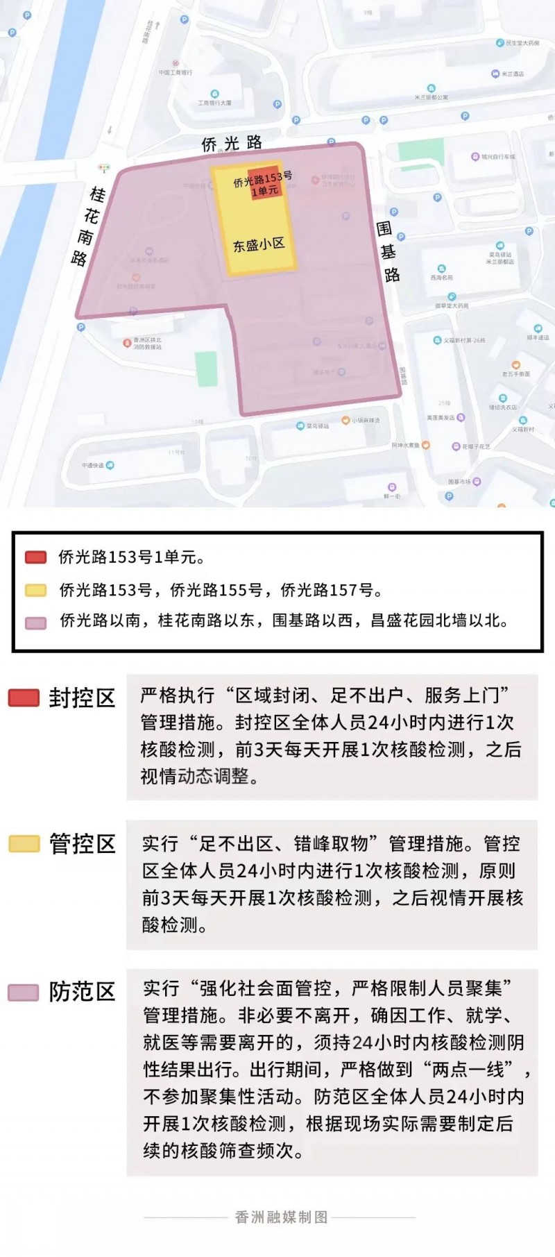 封控區(qū):僑光路153號(hào)1單元,嚴(yán)格執(zhí)行“區(qū)域封閉、足不出戶、服務(wù)上門”管理措施。封控區(qū)全體人員24小時(shí)內(nèi)進(jìn)行1次核酸檢測,前3天每天開展1次核酸檢測,之后視情動(dòng)態(tài)調(diào)整。