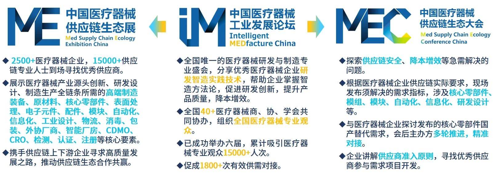 本屆同期進行IM工業(yè)發(fā)展論壇、MEC供應(yīng)鏈生態(tài)大會分別著眼于醫(yī)療器械研發(fā)技術(shù)與尖端制造工藝、法規(guī)注冊、供應(yīng)鏈生態(tài)研討與需求發(fā)布,實現(xiàn)“一展盡攬,兩會共贏”!