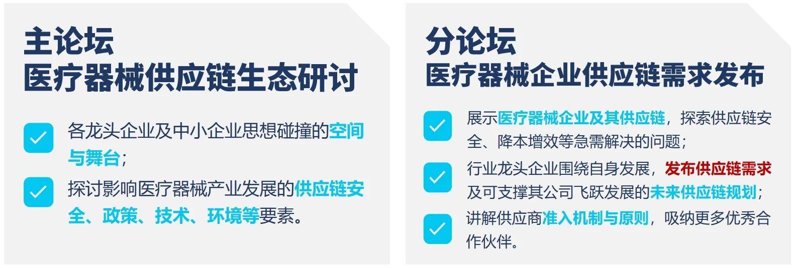 本屆ME供應(yīng)鏈生態(tài)展將以“一展兩會,同期舉行”的創(chuàng)新形式展現(xiàn),同期舉辦中國醫(yī)療器械工業(yè)發(fā)展論壇(以下簡稱IM工業(yè)發(fā)展論壇)及中國醫(yī)療器械供應(yīng)鏈生態(tài)大會(以下簡稱MEC供應(yīng)鏈生態(tài)大會)。