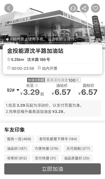 注冊個人信息后,就可以使用團油App去加油了。在確認好用戶的位置后,App上會顯示最遠50公里以內的與團油有合作的加油站。距離我所在位置最近的是5.58公里外的沈半路186號的金投能源沈半路加油站。上面顯示的油價非常誘人:原價6.57元/升的92號汽油,顯示只需要3.29元/升起;原價6.99元/升的95號汽油,顯示只需要3.50元/升起。價格下還有說明:低至3.29元起、3.50元起為浮動價,以支付頁面為準;完單后每升最高返加油金3.29元、3.50元。