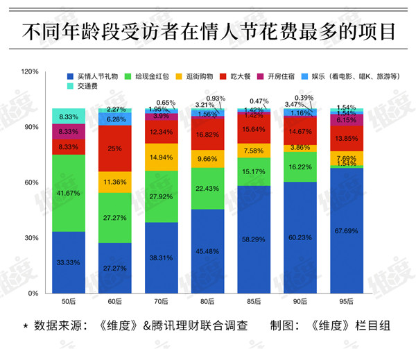 調查指出,95后當中不少還未走上社會,有38.1%的學生情侶,其節日花費主要來自父母,還有10.77%的95后依靠花唄、借唄、信用卡等消費貸款“借錢”過“情人劫”??傮w而言,越年輕越容易受到浪漫氛圍的感召,為過節花的錢也越多。