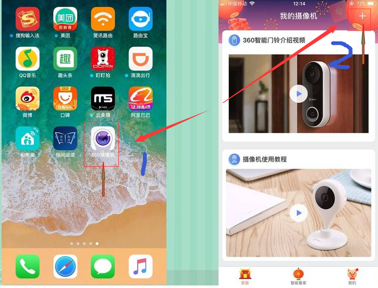 第二步,開始綁定門鈴,打開“360攝像機(jī)”,首先點(diǎn)開右上角“+”
