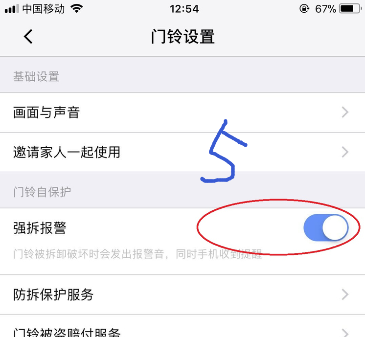 連接配置之后,我們到手機(jī)端開啟“強(qiáng)拆報(bào)警”,這樣以后如果有人偷拆時(shí),門鈴會(huì)發(fā)出警報(bào),手機(jī)端也會(huì)有提示!