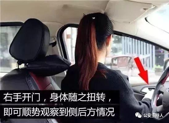 開車門用離車門較遠的手開(即左邊的人用右手,右邊的人用左手),這樣會“強迫”自己有一個轉體動作,以更好地觀察后方情況。