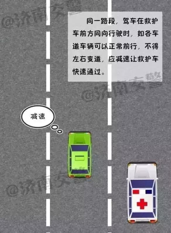2、同一路段,駕車在急救車前方同向行駛時,如各車道車輛可以正常前行,不得左右變道,應減速讓急救車快速通過;如遇各車道排隊緩行或交通擁堵,急救車在后方同一車道時,應當開啟轉向燈向左或向右變道讓行。
