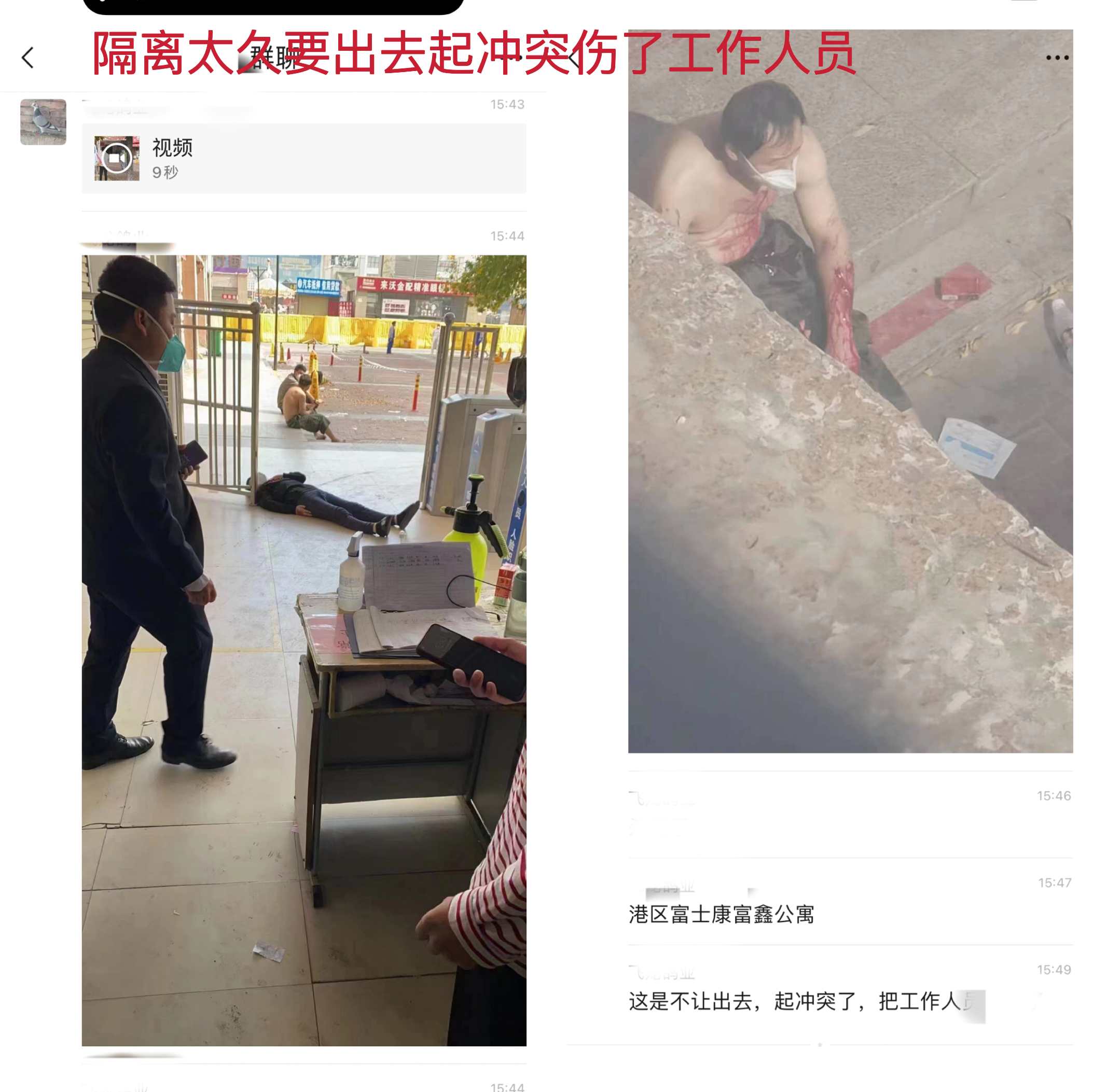 關于富士康疫情以來出現的一些負面新聞,包括富鑫公寓隔離人員因隔離太久要出去被工作人員攔下,因此起了沖突將工作人員捅傷、某小區有被隔離者試圖用床單出去從高樓摔下去、大量陽性病例哄搶物資等事件,我都看到過相關視頻,且不說視頻真假,能將人逼到如此境地,相信也是經歷了很大的絕望。