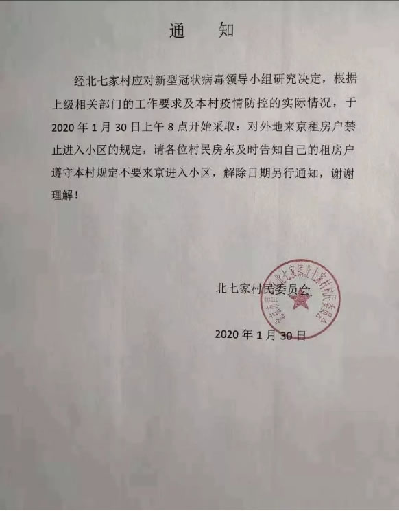 1月31日,北京市政府發文稱,“除必需行業外,各企業2月10日上班”,將迫在眉睫的返京大潮又往后推遲一個禮拜。只不過,這個文件仍然為企業要求員工返京彈性工作留有余地。已經回京的上班族,已有不少人已經在外流浪數日。陸續有北七家等地的房客被租住小區拒之門外,據不完全統計,這些小區當中的大多數都由村委會管理,這類強調“村民自治”的小區,自認為在社區管理層面有較大的自由度。他們對房客提出了要求,“自行在外隔離14天”,“14天后出示三甲醫院出具的健康證明”