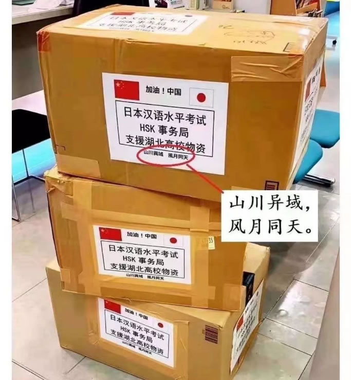 剛才在微博上看到一張照片,拍的是捐給武漢的三箱物資,上面貼了張標簽,“日本漢語水平考試考試HSK事務局支援湖北高校物資”,上面還有一行字,寫著“加油!中國”,下面還有一行小字,“山川異域,風月同天”。這兩個詞突然就擊中了我,它們似乎傳達出來的美好情感和復雜情緒,讓處在眼下境地中的我,愣了好一會兒。