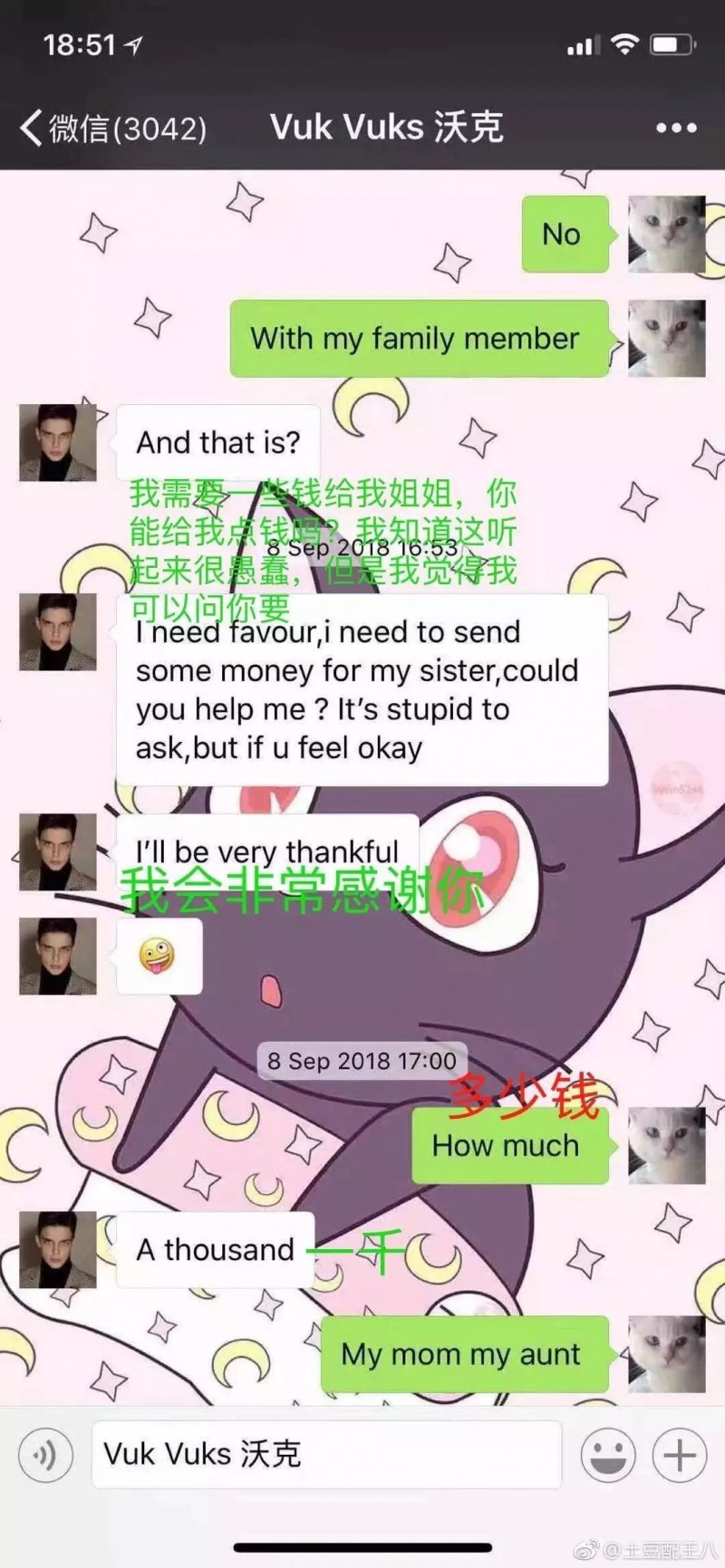 并且Vuk經(jīng)常編造各種理由騙錢: