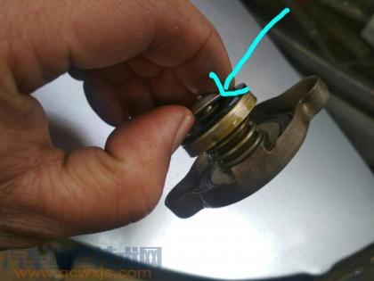 冷卻系統壓力由水箱蓋上的彈簧調節,壓力增大后推開水箱蓋上的彈簧,高溫冷卻液從水箱口側面的溢流口流入膨脹壺。上圖就是水箱蓋,可以看到里面有彈簧和密封墊。正常情況下密封墊將膨脹壺與冷卻系統隔絕,壓力大于正常值時會推開彈簧泄壓。
