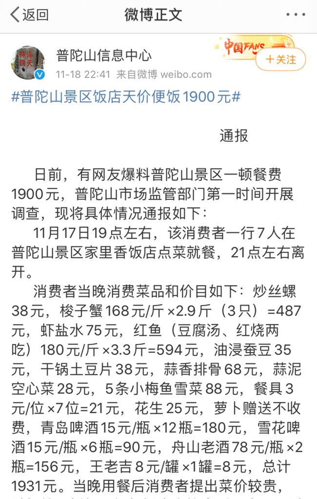 一頓飯1900多元,乍一看的確是挺貴的。于是當地市場監管部門立即介入調查。昨晚22時41分,普陀山風景名勝區通過其官方微博普陀山信息中心公布了市場監管部門的調查結果。