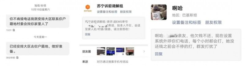 逾期兩天后,他等來了支付寶委托方的催收電話,當嘗試與對方溝通協商處理的意愿時,對方的回復是只負責催收,無權處理。被騷擾的還有王景的家人、村委會,以及通訊錄里的好友。至今3個月過去了,王景說:“已經承受不住了,天天電話騷擾家里人。我現在都不知道找誰協商,罰息越滾越高。”現在他的首要訴求是,立即停止對他通訊錄好友的騷擾和恐嚇。發稿前兩日,他把貧困證明發給借唄催收第三方的工作人員,依然無濟于事。孫乒同樣因疫情原因在蘇寧任性花上逾期了2千元左右,逾期第3天起,自己和通訊錄好友頻繁被發消息騷擾、打電話威脅,而且態度越來越惡劣。