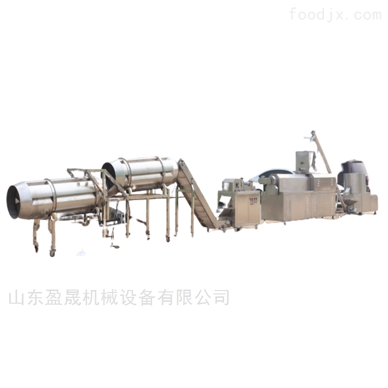 拌粉機→螺旋上料機→雙螺桿膨化機→風送機→ 多層烤箱→提升機→噴油機→雙滾筒調味機/八角筒調味機→(包裝機)