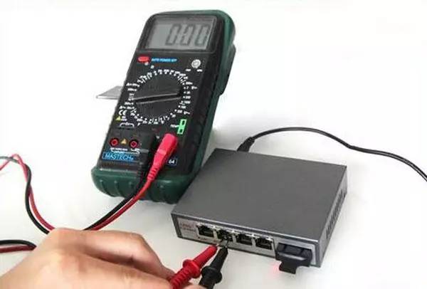 啟動設備,將萬用電表調至電壓測量檔位,用萬用電表兩表筆分別點觸PSE設備供電腳(通常是RJ45端口的1/2,3/6或者4/5,7/8),如果測出有48V或其它電壓值(12V、24V等)穩定輸出的設備即是非標產品。因為在這個過程中,PSE不對受電設備(這里為萬用表)做檢測,直接采用48V或其它電壓值供電。