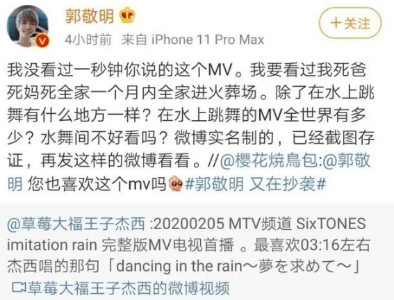 前段日子,有段時間沒動靜的郭敬明又上了熱搜。事情起因是5月13日那天,郭敬明發(fā)布了一支名為《少年之名》的MV。隨后不久,就有網(wǎng)友指出這支MV的創(chuàng)意涉嫌抄襲。郭敬明呢,按慣例,反手就是一頓懟。言辭之激烈,讓人隔屏都能感受到憤怒。雖然此次是否抄襲沒有官方認證,但是這其中反映的個人素質修養(yǎng),也是和“導師”身份格格不入的!