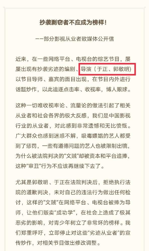 瓊瑤等111位影視從事者,在特殊的日子——冬至,對于正、郭敬明進行聯(lián)名抵制!向影視行業(yè)和社會發(fā)出強烈呼吁:不給抄襲剽竊者舞臺!將他們從公眾媒體中驅逐出去!