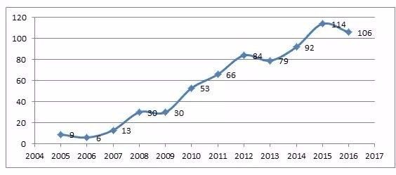 表1 2005年-2017年間充質干細胞臨床研究變化趨勢