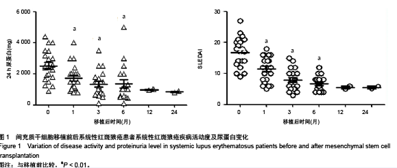 表5 間充質干細胞移植對SLE患者疾病活動度及尿蛋白的影響
