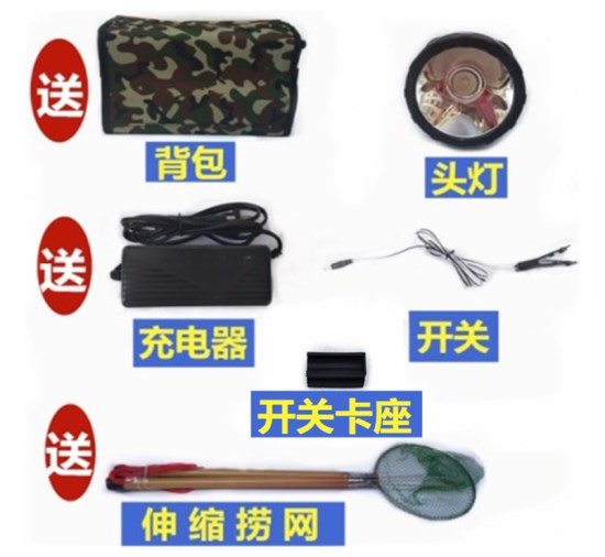 隨機(jī)配送:伸縮撈網(wǎng)一套 精致背包一個(gè) 防水開關(guān)一個(gè) LED頭燈一個(gè) 開關(guān)卡座一個(gè) 說明書及保修卡