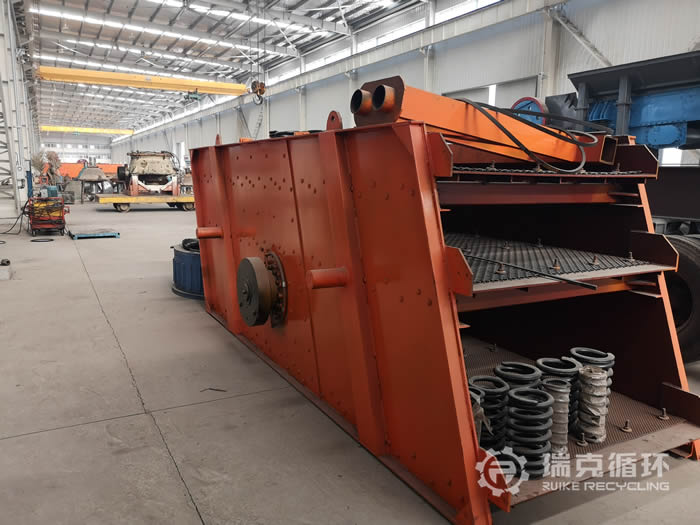 該臺3YK1545振動篩是我公司在山東回收的,由于生產規模的擴大,該臺設備篩分能力不能滿足生產的需要,將設備拆除轉讓給我公司。設備在篩分工作中性能十分的穩定,除了更換過篩網和易損件以外,沒有進行過其它的維修,設備運回公司以后,技術人員對該設備進行了拆機檢查,發現激振器主軸、撓性片等零部件保存都比較完好,只是篩網損壞和機身上有銹跡,隨后我公司更新更換了篩網、油脂等,并且進行了小時的試機,性能非常的穩定,各項數據也符合標準,然后給設備重新噴漆并做防銹處理。