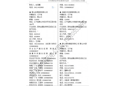 企業410家,其他有色金屬冶煉300家,冶金礦山設計單位20多家。單位公司名錄信息包括:單位名稱、詳細地址、郵政編碼、企業法定代表人、聯系人、聯系電話、所屬行業、投產時間等。