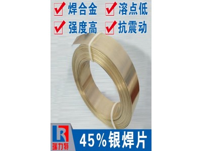 焊不銹鋼用45%銀焊片,焊銅/銅合金用45%銀焊片,焊合金刀具用45%銀焊片的公司牌號是:BAg45C,國標牌號是:BAg45CuZnCd,美標牌號是:BAg-1。是一種含45%銀、15%鋅、24%鎘16%銅的銀基非環保釬焊材料,固液相線:605~620℃,建議最低釬焊溫度:640℃。是銀銅鋅鎘系列綜合性能最好的產品,鋪展性、流動性、填充性極好。適用于有較高表面光潔度、強度及氣密性要求的鐵或鋼件、不銹鋼、硬質合金、銅或銅合金的釬焊,采用火焰釬焊,高頻釬焊、電阻釬焊都行,焊接時需添加助焊劑,如銀焊粉,銀焊膏等,且焊前需對工件進行除油除銹處理,因含有鎘,焊接時注意保持良好通風。廣泛運用于各種黑色金屬、除鋁/鎂外的各有色金屬及合金工件的釬焊,特殊適用于硬質合金刀具釬焊,釬焊面積大的工件。因其溫度低,特別適合有較低溫度要求及多級釬焊中的末級釬焊。性能優于BAg40C。寶貝常規規格有:0.1*40 0.15*40ER 0.2*40ER,圈裝帶材,寬度可訂制裁切。