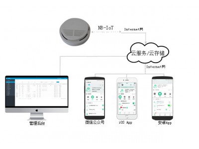 系統采用煙感作為一個媒介,運用 NB-IoT 通訊技術通過互聯網連接到云,當監測區域內煙霧濃度達到了預警峰值,NB-IoT煙霧探測器立即發出聲光報警,通過APP、微信公眾號、管理后臺、電話、短信等多途徑獲取到警情,第一時間將報警信號傳送給業主手機、物業管理,通知在場人員迅速撤離并報火警緊急處理險情。