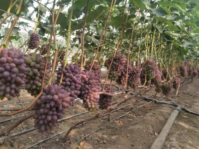 京玉玫瑰葡萄、該品種系歐美雜交種,雌性花,無核,抗寒抗病能力強,早產性好。經吉林大藥膨大處理后果穗緊密,果實大小整齊,果實顏色紫紅色,單果重8克。果穗圓筒狀,穗重500-1000克;果皮較韌,耐儲運,果實粉紅色。可溶性固形物含量22% ,有濃厚的茉莉香味,品質好。耐陰雨,成枝好,且產量高、含糖量高,品質好,豐產穩產。適宜大部分地區栽培,在2008年逐漸推廣開。
