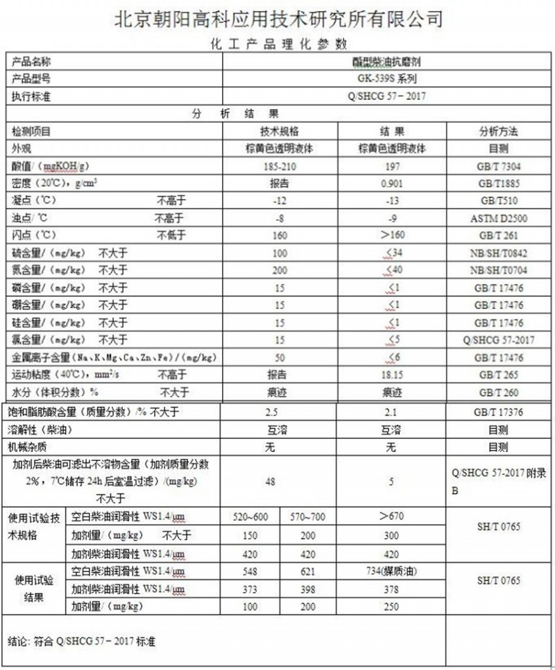 為應(yīng)對(duì)國內(nèi)柴油潤滑性差的現(xiàn)狀,我公司研發(fā)了GK-539S系列酯型柴油抗磨劑,從而有效應(yīng)對(duì)柴油低硫化對(duì)柴油潤滑性能的要求,為柴油低硫化技術(shù)發(fā)展提供有效技術(shù)支撐。