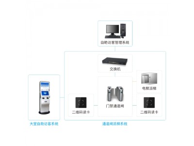 在一樓大廳部署自助訪客機,在管理中心部署訪客管理系統,通過交換機連接自助訪客機,通道閘控制系統,電梯控制系統,通道閘進出安裝二維碼讀頭,通過自助訪客機申請后打印二維碼憑條,到通道閘掃碼開閘及聯動呼梯。