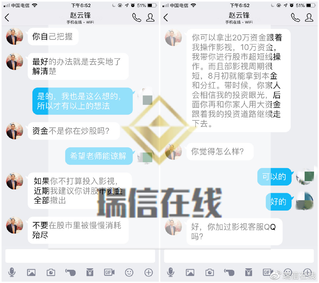 趙云峰將該部電影的項目資料,商業計劃書、廣電總局的備案材料的資質背景都發到了群里,贏取我們的信任,以短期就有收益為由,群里很多人都發出了盈利截圖,我還信以為真,后來投了10萬,結果到最后一點音訊都沒有,群也解散了,才發現事情不對。便去搜索相關信息,看到了瑞信維權(vx:1052140986)曝光電影投資偏局的文章才醒悟,咨詢后才知道這原來就是個騙局。最后在瑞信維權的幫助下,真的追回了虧損的投資資金,整個過程只用一周的時間!
