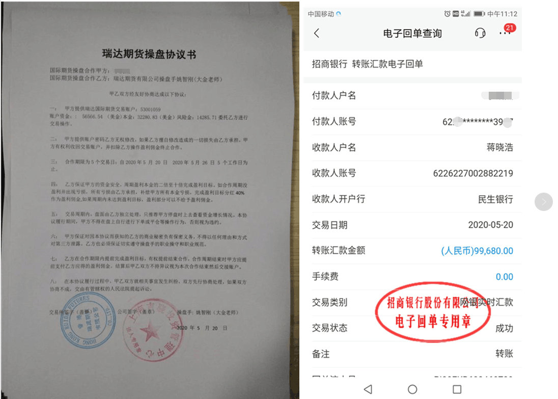 據(jù)另一名投資者描述他的經(jīng)歷又是截然相反,李先生說(shuō)他在瑞達(dá)期貨投資平臺(tái)投入了40萬(wàn),他不斷沒有虧錢反而賺了80多萬(wàn),但是不能出金,問(wèn)題出在老師替他操盤簽了一份操盤協(xié)議,協(xié)議中說(shuō)明盈利了委托人要支付40%盈利分成,在與老師協(xié)商后老師答應(yīng)李先生先支付10萬(wàn)元,就可以出金了,當(dāng)李先生真的把10萬(wàn)打過(guò)去后,老師又說(shuō)公司不同意,必須將盈利分成32萬(wàn)元全部支付才能給出金,直到這一刻李先生才醒悟他們這是連環(huán)套,入金40萬(wàn)加上分成10萬(wàn),他已經(jīng)被騙50余萬(wàn),從上面兩個(gè)案例你能看出什么嗎?他們?yōu)榱丝焖偈崭钜呀?jīng)不測(cè)手段了,如果你也遇到這樣的投資騙局保存好相關(guān)證據(jù),聯(lián)系我,幫你出謀劃策,提供法律援助,幫你挽回?fù)p失。