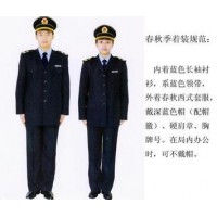 。 套式肩章:133cm×50cm,大衣佩帶。 (四)臂章:盾牌外型,圖案由中國衛生監督中英文及衛生監督徽組合而成,面料及工藝同肩章。 三、服裝面料及式樣 (一)制服:藏藍色,以江蘇陽光集團3710#為標準色,秋冬季厚面料,春夏季薄面料,單排扣西式套裝,式樣見附圖(略) 新版式 定制 量體裁剪 驗貨付款 高支棉 精做工 歡迎來廠制作 二)胸牌號:鋅鋁合金材料工藝合成,白色6位阿拉伯數字、黑色支架,背面兩孔距離4.8cm。6位編碼的1—2位為省級區劃代碼,4—6位為衛生監督員編碼。