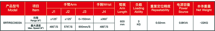 BRTIRSC060 3A是針對某些單調、頻繁和重復的長時間作業等而開發的一款水平四軸機器人,其擁有600 mm臂展, 最大負載可達3kg。多自由度的靈活性主要用千印刷包裝、金濮加工、輕紡家居、電子裝備、等領域。