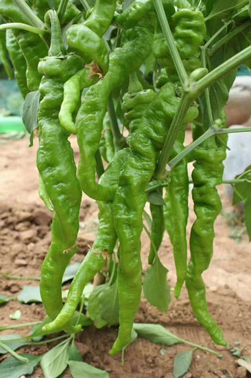 6、線椒苗:中早熟品種,株型矮小緊湊,生長勢強(qiáng),株高約75厘米,果實(shí)簇生,長指形,果長15厘米。辣味適中,商品性佳,具有良好的抗病性、豐產(chǎn)性、穩(wěn)產(chǎn)性,多種加工特性。