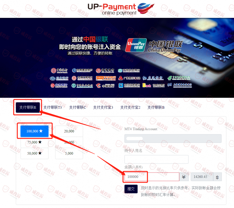 且看下圖,支付通道E (Easy Pay)可以一次經個人轉賬的方式入10萬人民幣,每天沒有次數限制,雖然現在國家是在嚴打非法資金,正所謂道高一尺,魔高一丈,許多無知的投資者把大筆的資金轉入到非法炒匯平臺,等發現受騙上當之后才來維權立案,往往都是為時已晚。
