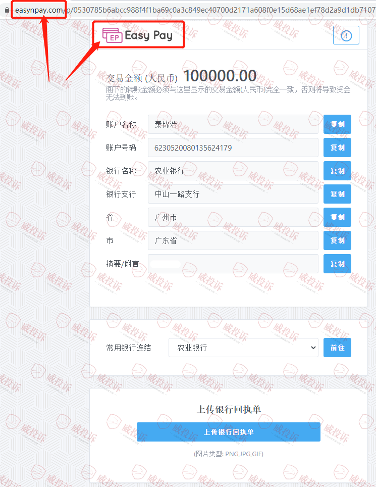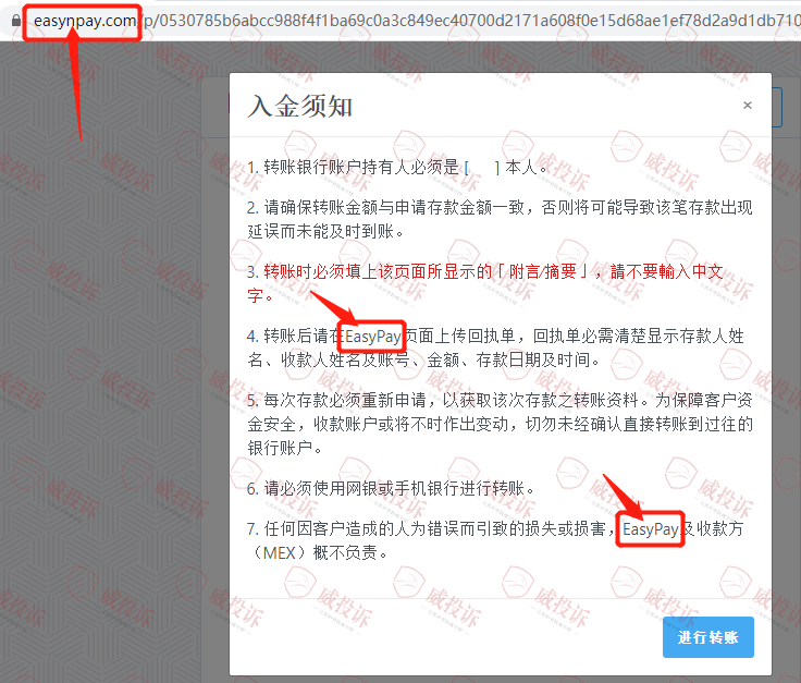 如果大家留意,排在最前面的一個入金通道叫支付銀聯E,聽說這個通道幾乎占了所有入金的80-90%,為什么一個通道可以承包這么多入金呢?原因是因為這個支付通道E(支付公司叫Easy Pay,如下圖), 是MEX大通金融支付部門負責人的男朋友開的,正所謂肥水不流外人田,這位支付部門負責人當然要把她男朋友的通道放在第一位,據說在中間加了不少點,光撈中間流水的傭金就讓她肥得漏油了。