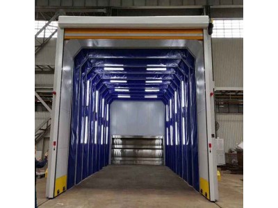 2.移動龍門架結構是伸縮式噴漆房的伸縮牽引支架,它包括了龍門架、伸縮移動驅動架、伸縮警示燈。伸縮動力裝置即伸縮移動架及安裝在伸縮架上的驅動電機、減速箱、主動輪及其傳動系統。移動龍門架安裝在伸縮驅動架上。