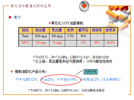 工業應用: 原料油: 終餾點≯380℃、硫含量≯15000 PPm、氮含量≯900 PPm; 工藝條件:反應溫度:310~360 ℃、反應壓力:6.5~14.0 MPa、 體積空速:0.5~1.5 h-1、氫油體積比:500~1600 壽命: 催化劑的使用壽命3~6年(視原料而定),且能再生。