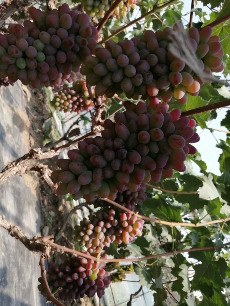 雌性花,無核,抗寒抗病能力強,早產性好。經吉林大藥膨大處理后果穗緊密,果實大小整齊,果實顏色紫紅色,單果重8克。果穗圓筒狀,穗重500-1000克;果皮較韌,耐儲運,果實粉紅色??扇苄怨绦挝锖?2% ,有濃厚的茉莉香味,品質好。耐陰雨,成枝好,且產量高、含糖量高,品質好,豐產穩產。適宜大部分地區栽培,在2008年逐漸推廣開。