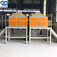 吸附工作:當廢氣進入凈化設備后,由于截面急劇增大,風速下降,大塵粒(顆粒物)在重力作用下得到沉降;隨后進入干式過濾箱,進行過濾,確保后端設備零粉塵顆粒或微粉塵顆粒進入;接近無塵有機廢氣經過多層蜂窩活性炭吸附,后干凈達標的氣體排放至煙囪。