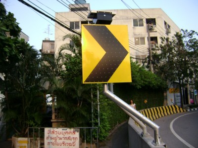 太陽能警告標志是以單晶硅太陽能電池組件為能源,它利用太陽能電池板將白天的陽光轉換成電能貯存于蓄電池中,當夜幕降臨、視線昏暗或雨霧天氣等視線不佳情況下,線性誘導標志牌上的發光二極管自動啟動閃爍,通過LED發出亮光來勾畫圖案輪廓,傳達交通信息。主動發光線性標志發出的光線特別明亮、醒目,具有強烈的警示作用。