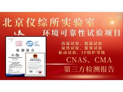 北京儀綜所環境可靠性及電磁兼容檢測中心,位于北京市西城區廣安門外大街甲397號,是CNAS認可機構、CMA認可機構,提供各類電工電氣、儀器儀表、電子設備、通信設備、電路板卡的環境可靠性試驗——高低溫試驗、恒定濕熱/交變濕熱/高溫高濕試驗、鹽霧試驗、霉菌試驗、機械化振動、高加速沖擊、IP防護等級認證(IP68、IP65、IP54等)。