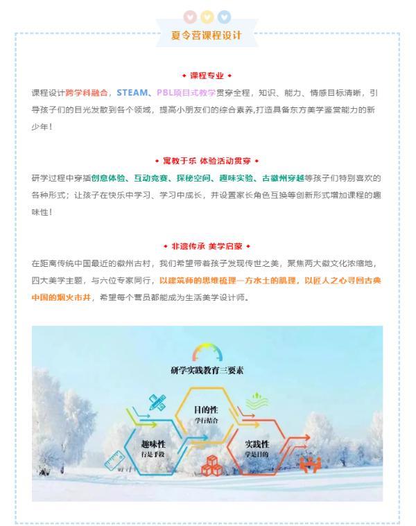 以設計思維重拾東方審美與生活,推出古韻徽州 美學啟蒙研學營。三大特色:底蘊深厚+課程專業+體驗互動貫穿,7000多年徽文化+跨學科融合+鍛煉綜合能力,徽文化濃縮地 四大美學主題 多位專家同行。