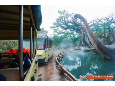 該場地仿照了侏羅紀時期熱帶雨林風格建造,給大家營造了身臨其境的環境。大家s先坐上專屬列車,來到雨林深處,隨后排好隊伍開始徒步。