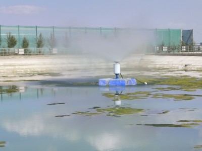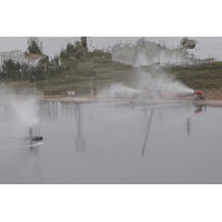 蒸發塘噴霧機,電動機通過支撐柱安裝在浮臺上,電動機的動力輸出軸上設置有扇片,增壓水泵固定在浮臺下方,電動機外壁上固定有噴水裝置,增壓水泵通過水管與噴水裝置相連通,噴水裝置的出水口位于扇片的下方。本實用新型的有益效果在于:1、采用增壓水泵供水,噴水裝置的出水口位于扇片的下方,在扇片的作用下,水與外界環境接觸時間長,蒸發效果好。2、工程投資低、操作管理簡單、安裝拆卸方便、占地面積省等特點,可完全彌補自然蒸發塘的缺點。3、安裝在蒸發塘上,起到加強蒸發的作用,可增強蒸發效果14~30倍,蒸發同樣的廢水所需蒸發塘面積可降低到原來的1/10。