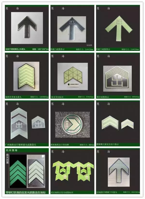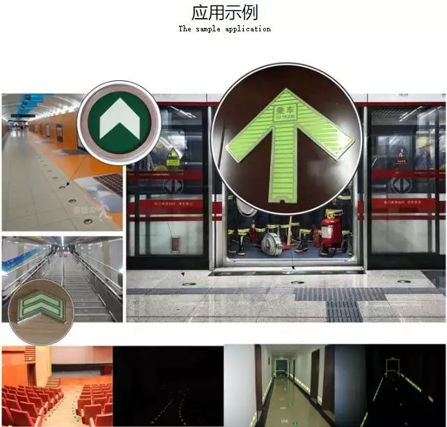 不銹鋼夜光產品主要運用在地鐵站。它主要功能就是地鐵站消防逃生應急導向其中包括自發光疏散導向標識,屏蔽門門界石上下車箭頭標識,自發光型站廳,站臺地面消防疏散指示標識,自發光型步行樓梯踢步疏散指示標識。